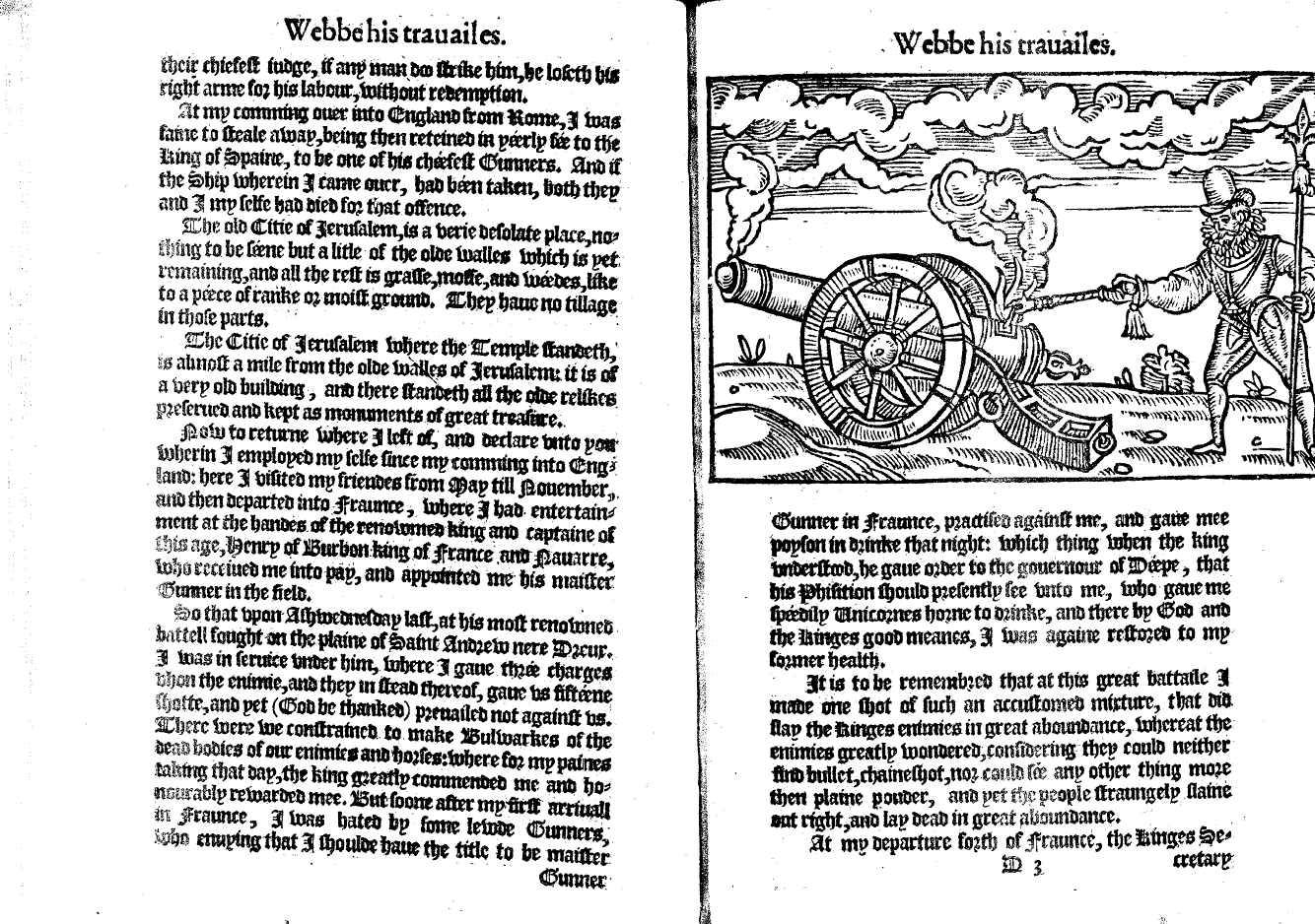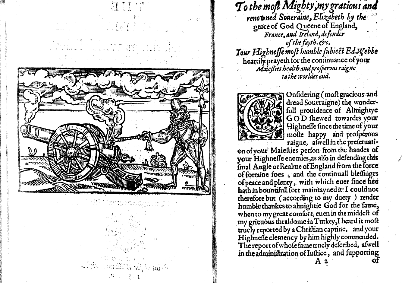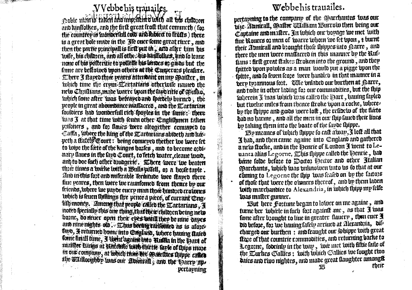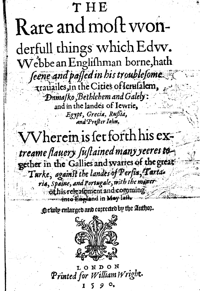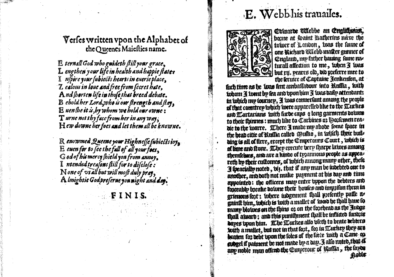 I Edwarde Webbe an Englishman, borne at Saint Katherins (nerre? =near?) the tower of London, was the sonne of one Richard Webb master gunner of England, my father having some naturall affection to me, when I was but (?) yeares old, did preferre mee to the service of Captaine Jenkenson, at such time as he was sent ambassadour into Russia, with whom I went by sea and upon him I was daily attendant: in which my journey I was conversant among the people of that countrey which were apparelled like to the Turkes and Tatarians with (? furde??) caps & long garments downe to their shinnes: much like to Carbines or (?) readie to the warre. There I made my abode some space in the head citie of Russia called Musko, in (which?) their building is all of firre, except the Emperours Court, which is of lime and stone. They execute very sharpe lawes among...