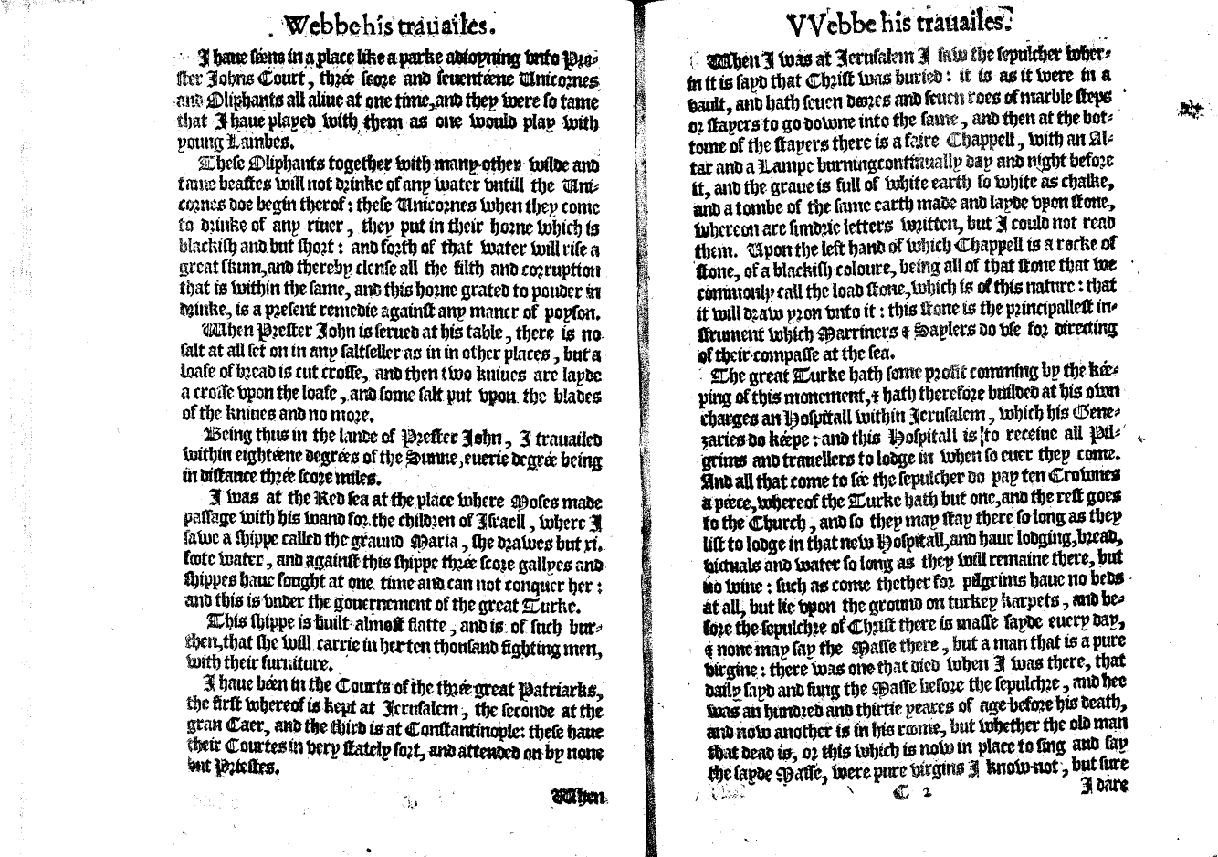 В ней подробно разбирается вся книга Веба и множество противоречий в ней. Любопытно отметить следующее: по-видимому, Веб был первым из "путешественников-рассказчиков", кто в своём предисловии специально заверяет читателя, что описывает только то, что видел собственными глазами, и нигде не врёт и не преувеличивает (к концу 16-го века такие заверения стали необходимыми, т.к. "путешествия" были полны столь фантастических выдумок, что им перестали верить и стали воспринимать весь жанр в качестве фарса; Веб был первым, кто вставил такие заверения в своё предисловие, но вскоре после него это было уже чуть ли не стандартным приёмом). Несмотря на эти заверения, в книге Веба есть всякие очевидные выдумки типа фантастический зверей, а также описание его пребывания в мифической азиатской (по другим версиям — африканской) стране, управляемой христианским королём по имени Prester John (интересный очень миф, кстати). Кроме того, в описаниях Веба конкретных событий есть множество хронологических противоречий и нестыковок. Хайм заключает, что нет вообще оснований считать, что Веб покидал Англию; всё, что он написал, он мог вычитать в более ранних источниках, в первую очередь (в том, что касается Ближнего Востока) в путешествиях сэра Джона Мандевиля (появились впервые в 14-м веке. Очень знаменитая в средние века книга путешествий в Святую землю. Уже в наше время историки доказали, что и она, в свою очередь, является компиляцией других источников; об этом можно прочесть подробнее здесь).