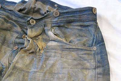 These trousers were cut very high, which made belts impractical. No one made pants with loops or used belts to tie their trousers. Pants with belt loops could have been made in prehistoric times. Yet they were not. The 19th century cowboys could have displayed those huge brass buckles on their wide leather belts that one sees in the Hollywood movies. They did not. These movies are as faithful to history as the ones showing pre-historic men in hippie outfits and leather boots. Still "everyone knows that cowboys wore humongous brass buckles on their belts." There is a whole industry of authentic cowboy belts and buckles. Wearing such accessories seems to be a logical thing for a cowboy to do. The real cowboys did not know about that and wore suspenders.