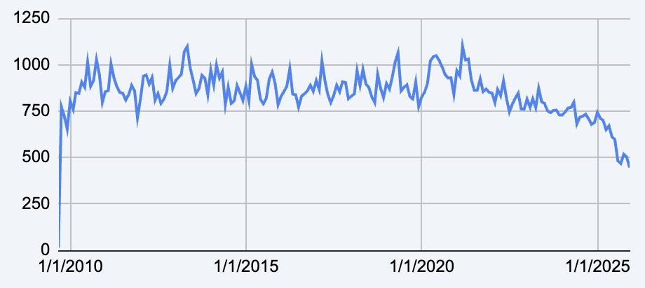 Date: 2026-01-06 01:17 pm (UTC)Количество вопросов в месяц на Mathoverflow тоже упало, но не так - где-то с 1000-1100 до 450. Но пооизводная отрицательная.